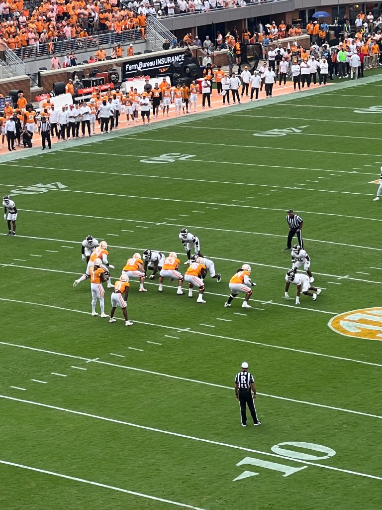 Tennessee and Texas A&M players face off in the first play of the game in Neyland Stadium on Oct. 14, 2023. (Shelby Wilson/UTK Student Journalist)